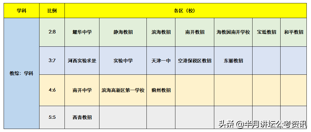 2020年教综&学科都考的区(校)有:益中、河西实验求是、南开中学、实验中学、南开翔宇、天津一中、新华中学、耀华中学、静海二招、西青王稳庄编外、滨海教招1月、南开教招、西青教招、海教园南开学校、空港保税区教招、宝坻教招、东丽教招、和平教招、蓟州教招、滨海教招7月、静海一招