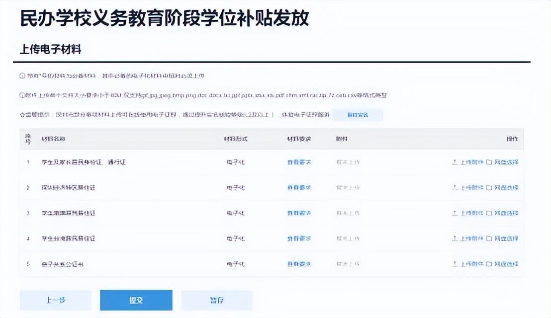 上学期申领过宝安区学位补贴学生无需上传任何电子材料,直接点“提交”跳过上传材料步骤;上学期未申请或已申请未通过学生需按户籍类型上传相关证件电子照片,上传所需的材料后,点击[提交]完成补贴业务的申办。