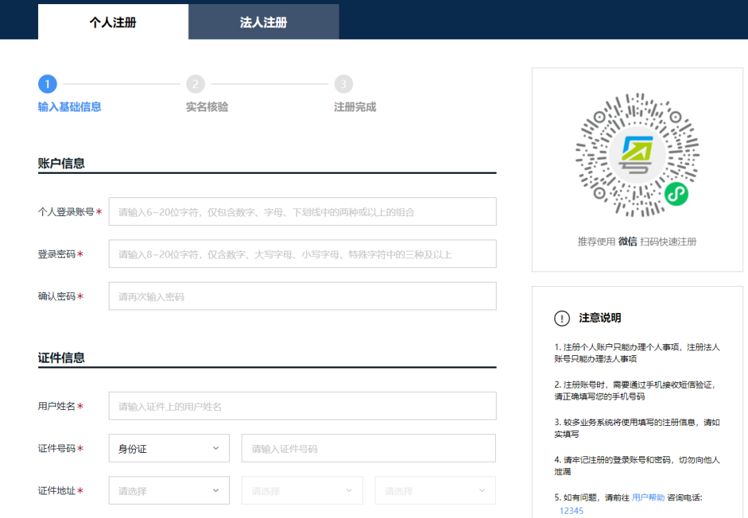 带*号为必填项(除上传证件页面除外),手机号码填写监护人手机号码。在[个人注册]页面按照要求填写好信息,账号注册成功,并会以短信的方式将注册的账号告知用户。
