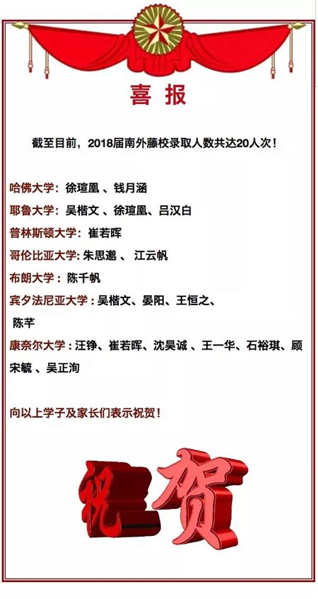 南外参加高考的人数总是非常有喜感(20人左右),除了保送生,其他人都出国了。2018年,南外有20人被美国常青藤大学录取,其中6人进入哈佛、耶鲁、普林斯顿。