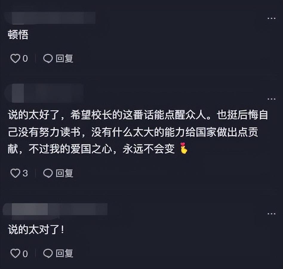 “说得太好了,希望校长的这番话能点醒众人。也挺后悔自己没有努力读书,没有什么太大的能力给国家做出点贡献,不过我的爱国之心,永远不会变”