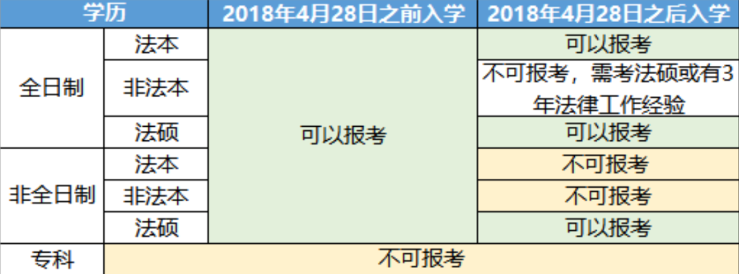 在2018年4月28日后入学的全日制非法本+从事法律工作满三年的考生有报考资格;关于“从事法律工作满三年”的具体要求,详见司法部及各地司法厅、司法局的公告。
