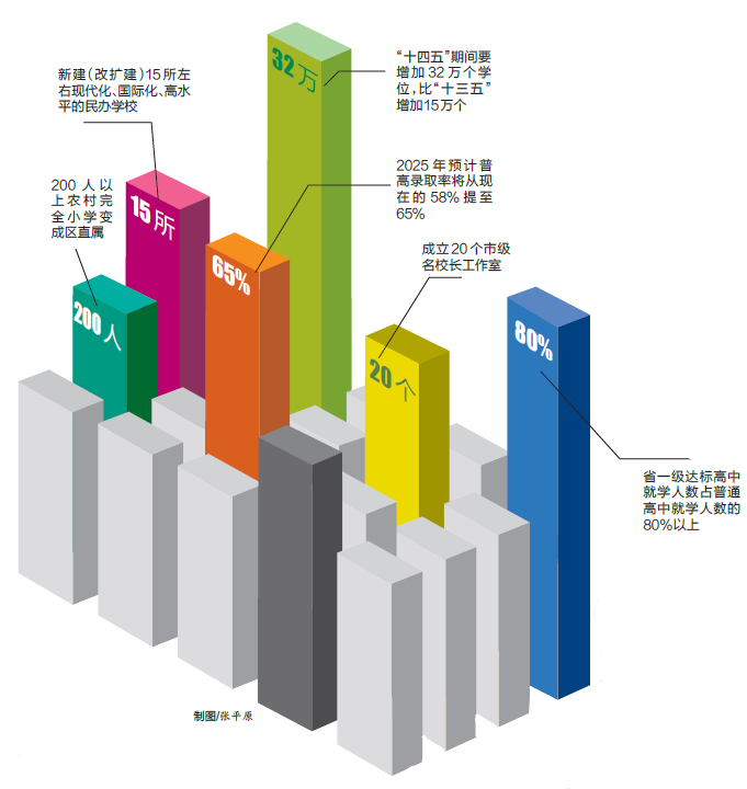 在十四五期间二十个重点项目中,学校建设项目:到2025年,规划建设32万个左右中小学幼儿园学位数,同时新建(改扩建)15所左右现代化、国际化、高水平的民办学校,新增各级各类民办学位1.5万个左右。