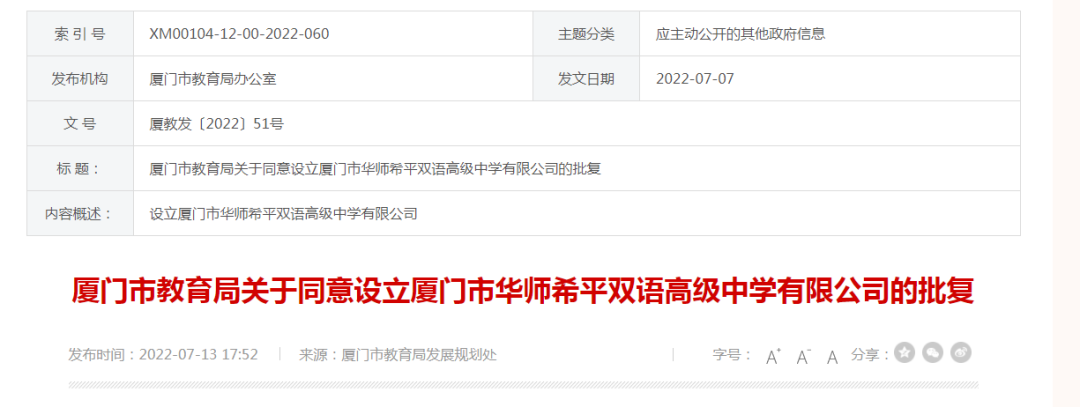 不久前,厦门市教育局发布关于同意设立厦门市华师希平双语高级中学有限公司的批复。