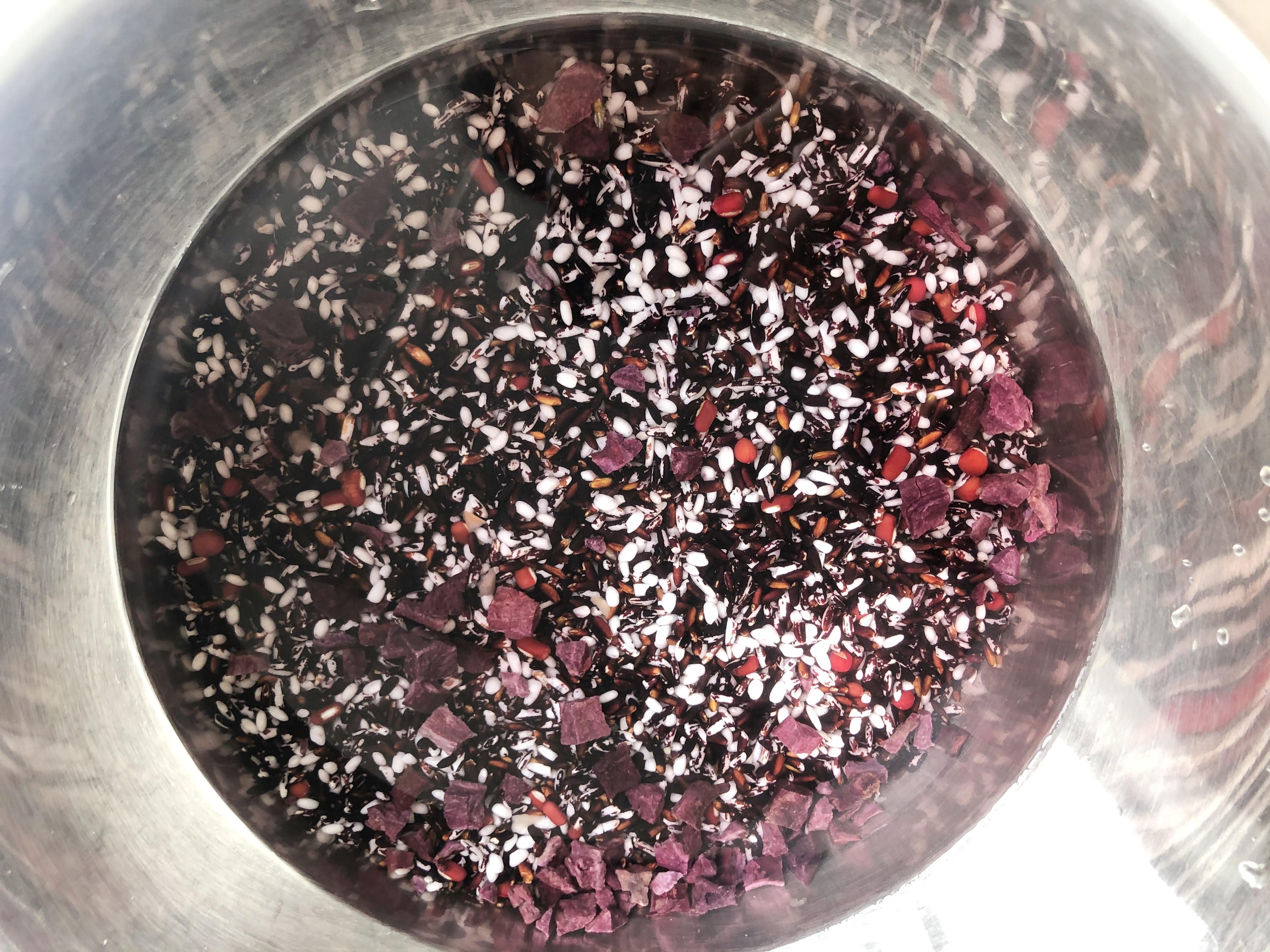 【食材】黑糯米,白糯米,紫糯米,红豆,紫薯丁,蜜枣