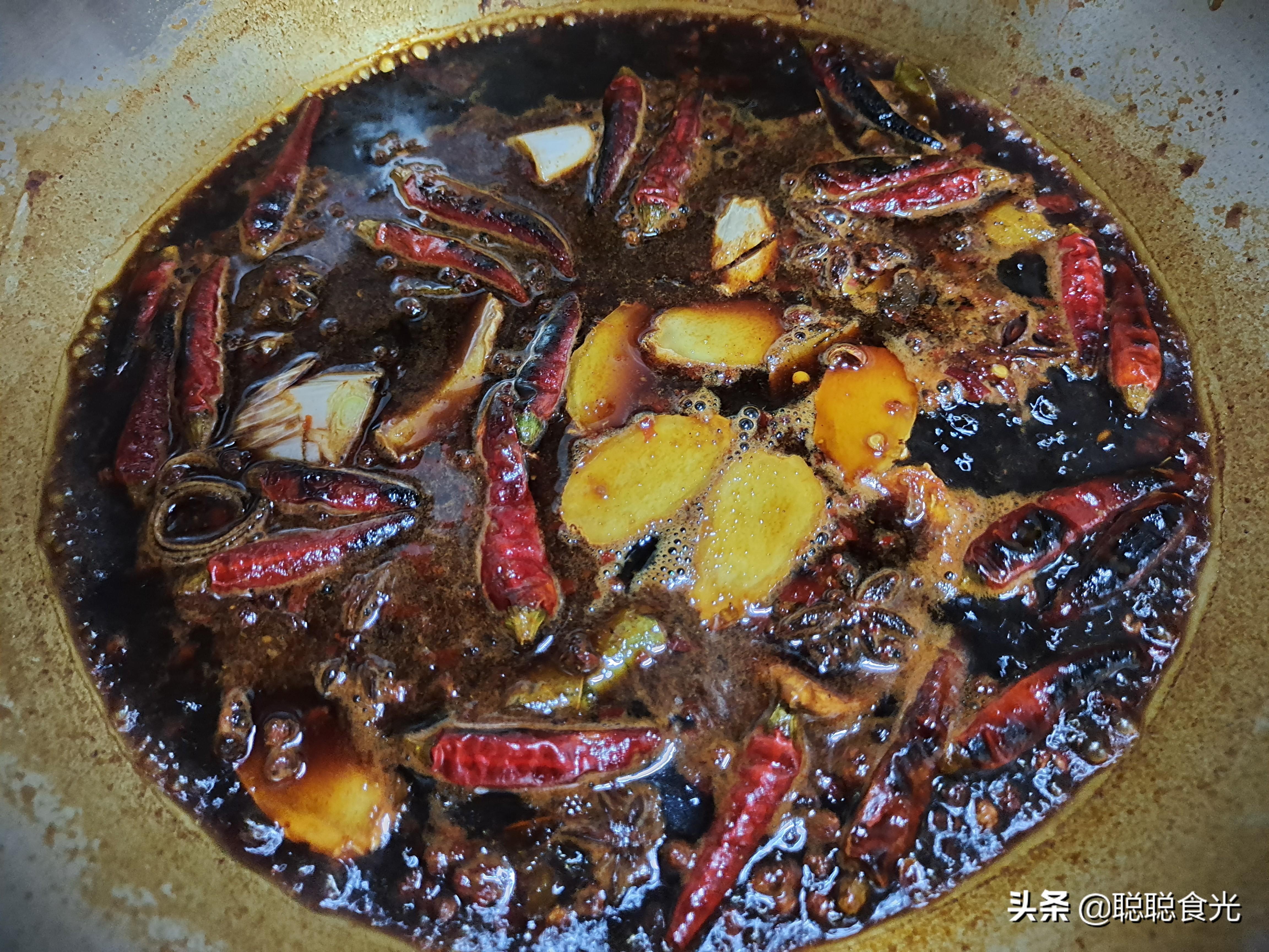 第三步:锅里倒入一点点油,把葱、姜、八角、香叶、桂皮、花椒和辣椒放入油中煸炒出香味,加入1勺豆瓣酱和1勺甜面酱,酱的种类随意选择,按喜欢的口味加就可以。