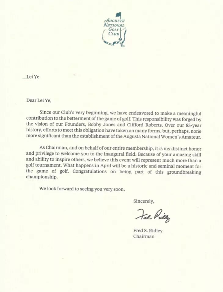 近日,中国业余球员叶雷收到来自奥古斯塔国家高尔夫俱乐部的邀请函,参加第一届奥古斯塔国家女子业余锦标赛。赛事将在2019年4月举行,而叶雷也成为中国内地第一位收到该项赛事邀请的球员。