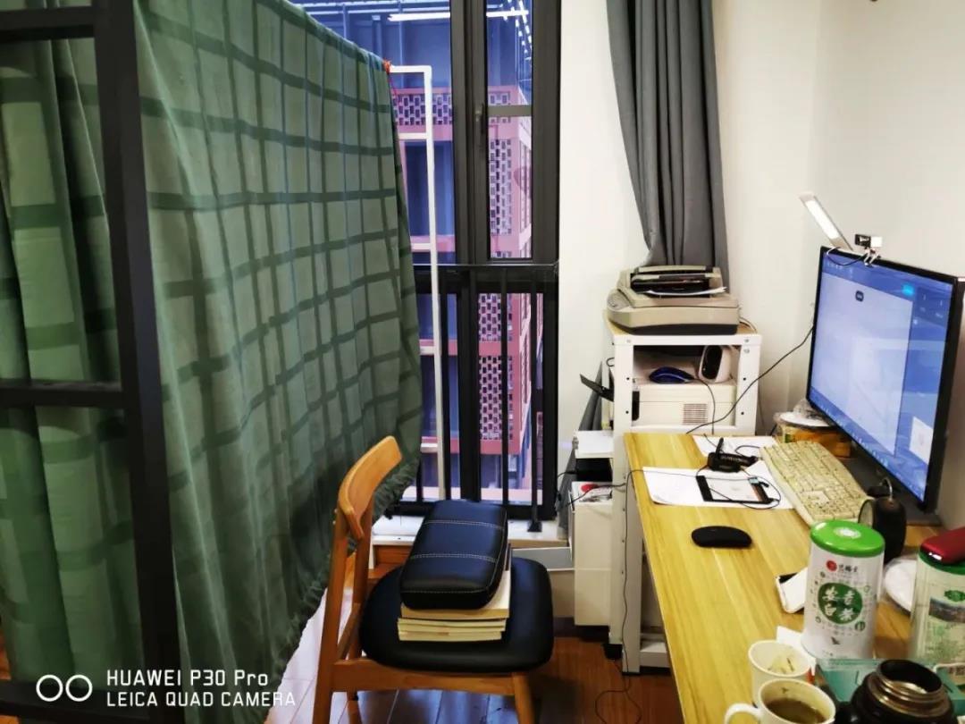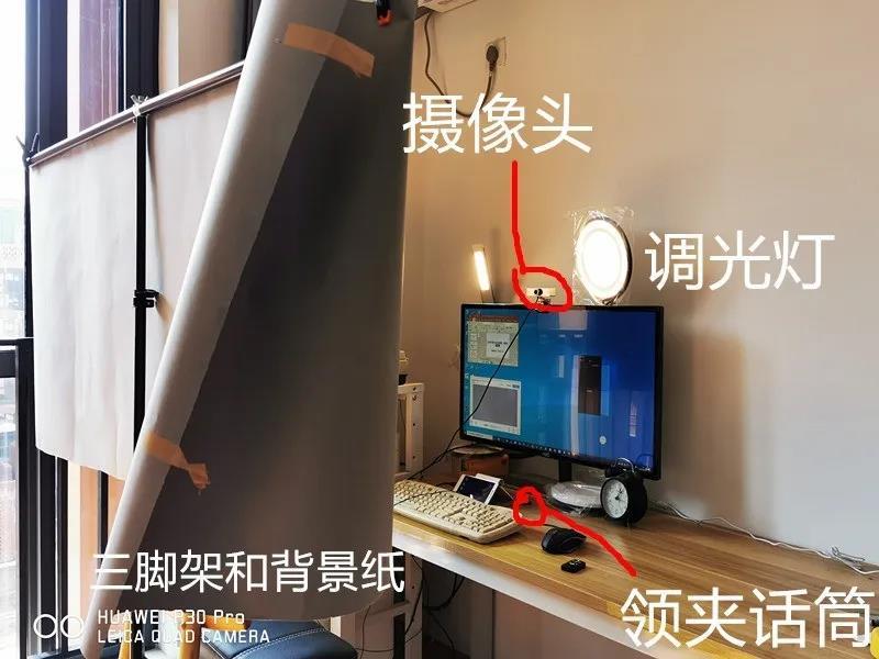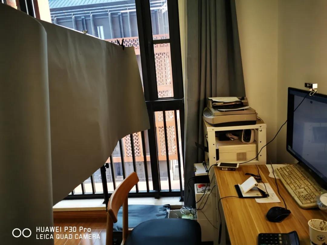 摄像头和领夹话筒是去年上半年买的,平时放在办公室里派其他用处,最近正好用来做直播。丛杭青又从家里找了两台可以调色温亮度的台灯当作调光灯。至于直播背景,一开始他在办公室找到两个铁架子,在铁架子顶端绑上一根家里晾衣服用的竹竿,再把家里落地窗的窗帘取下来挂在竹竿上面,这就制成了他的第一代直播背景。在试播后,丛杭青精益求精,对直播背景进行了升级,他找出办会议用的海报架,将海报架改造成夹背景纸的三角支架,最后安上一张大幅的灰色背景纸,利用旧物制成了第二代直播背景。