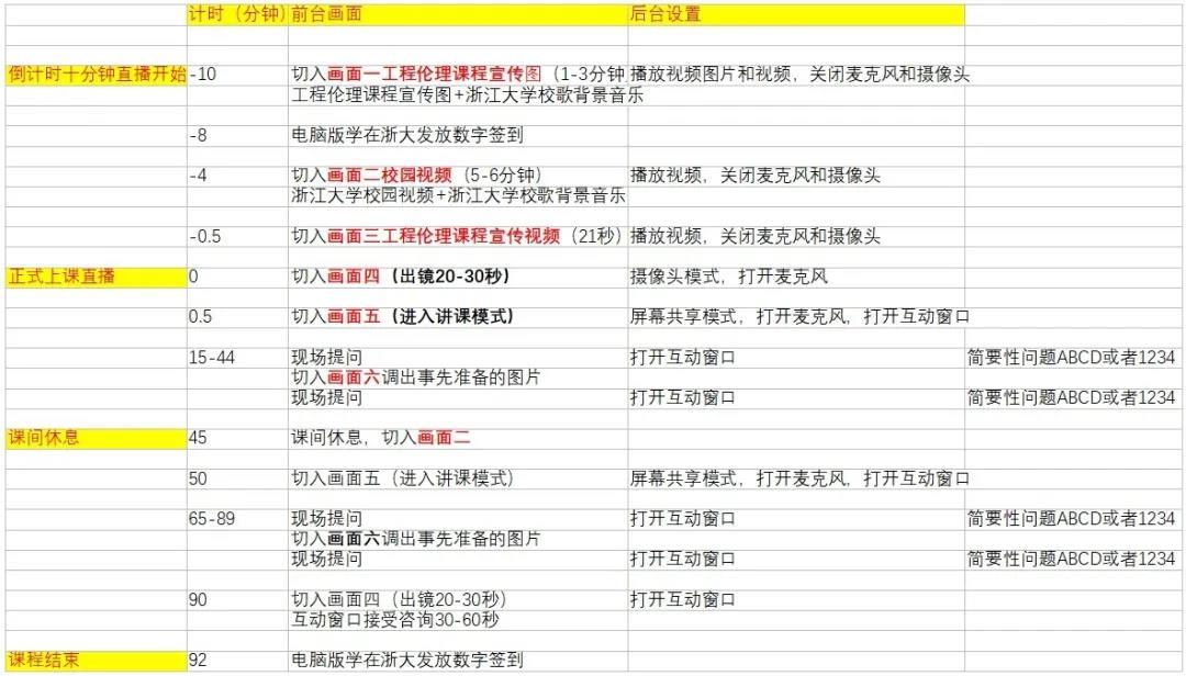 既要播放校园风光短视频,又要进行理论讲授,同时还要兼顾学生提问和课堂互动,如何做到有条不紊呢?丛杭青特地在课前制定了“专业模式流程检查表”,严格按“脚本”进行线上直播教学操作。他的课程大致分为四五个不同场景,上课前10分钟切换到场景1播放校园风光短片,同时进行数字签到;上课前20秒切换到场景2播放工程伦理导论的课程宣传片;到点上课时切换到场景3摄像模式,出镜向学生说欢迎语,介绍本次课程的内容大纲;讲课时切换到场景4屏幕共享模式,播放PPT讲课的同时兼顾学生临时提问;课上到15分钟左右时,通过互动面板进行课堂互动;课间休息时切回场景1,再次播放校园风光短视频。