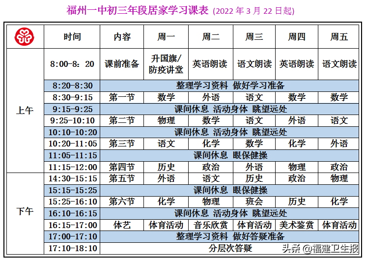 以福州一中为例,早上8:00-8:20就开始一天的课前准备,由老师带领早读或各班补缺补漏。和线下一样开展多学科的网上授课,傍晚进行分层次答疑。并通过互动,打卡,随机提问的方式,逐渐培养孩子自觉自律的能力。