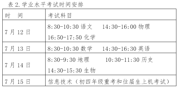 综合考虑疫情防控和教学组织需要,2020年初中学业水平考试安排在7月12-15日进行,考试科目和会考科目具体考试安排如下。