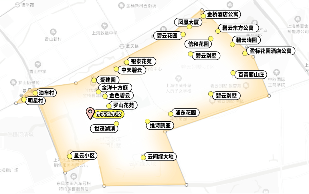 金桥爱建园位于碧云路199弄,属于碧云国际社区,社区分两期开发,与上实东校直线距离仅约300米。