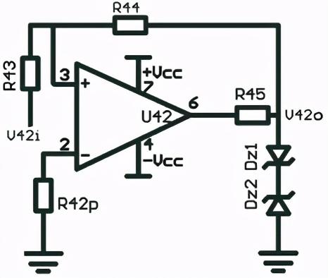 A: 6.2kΩB:12kΩC:24kΩD:51kΩ答案: 【12kΩ】9、迟滞比较器电路如下图,Dz1、Dz2都为6.2V稳压管,正向导通电压按0.7V计算,R43、R44的取值分别为10kΩ和30kΩ。若要把三角波转换成方波,则输入三角波的幅度不能小于( )。
