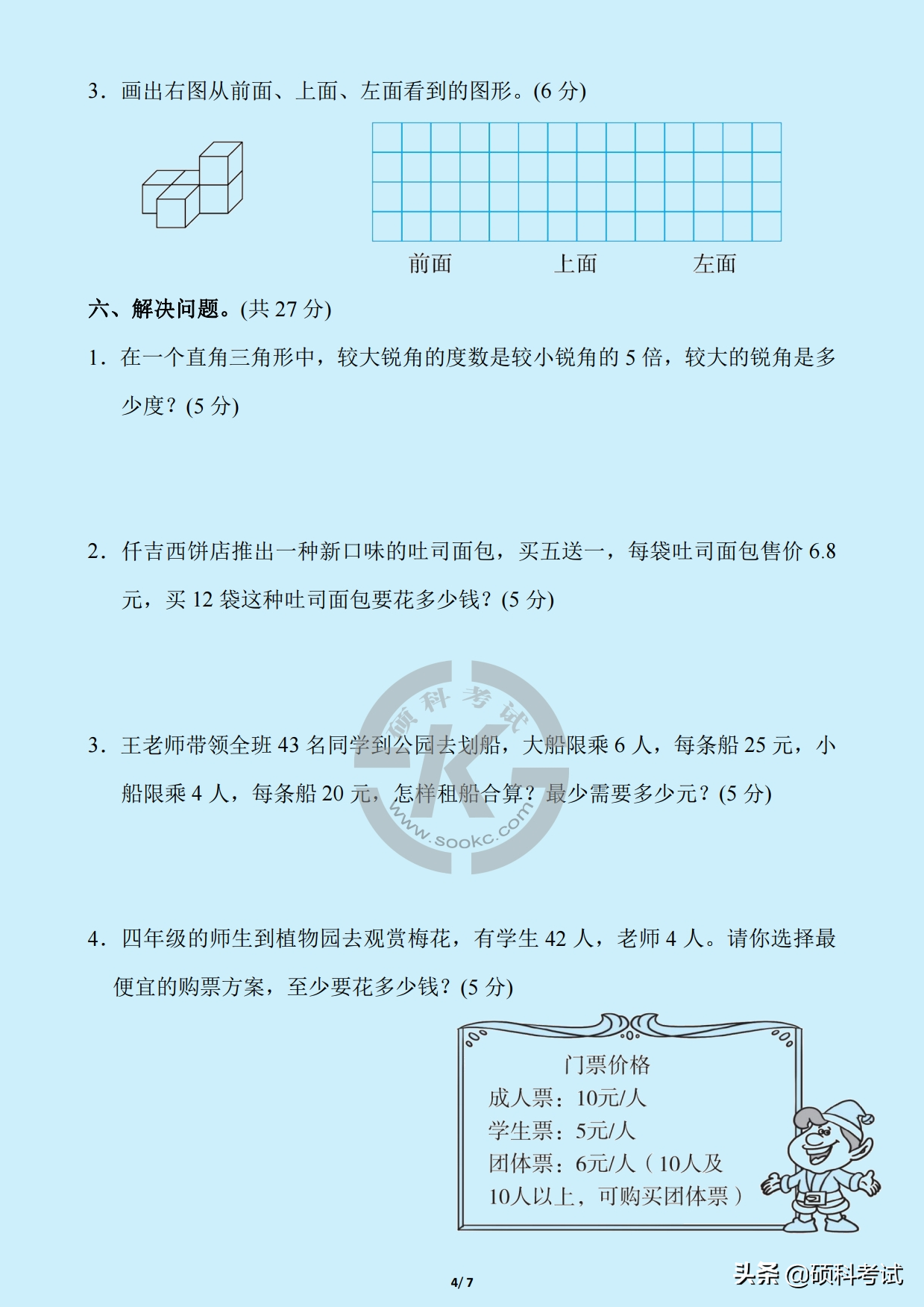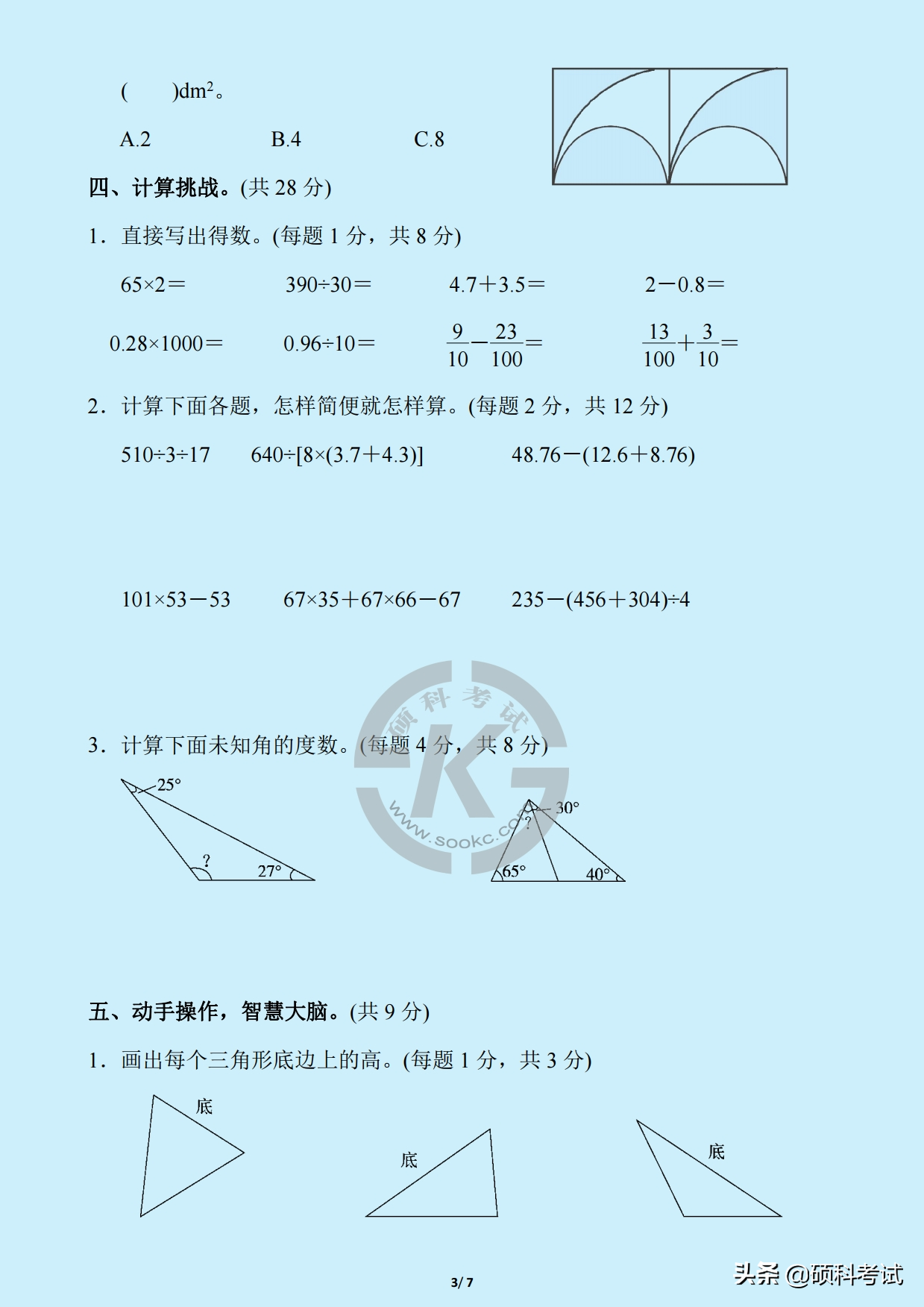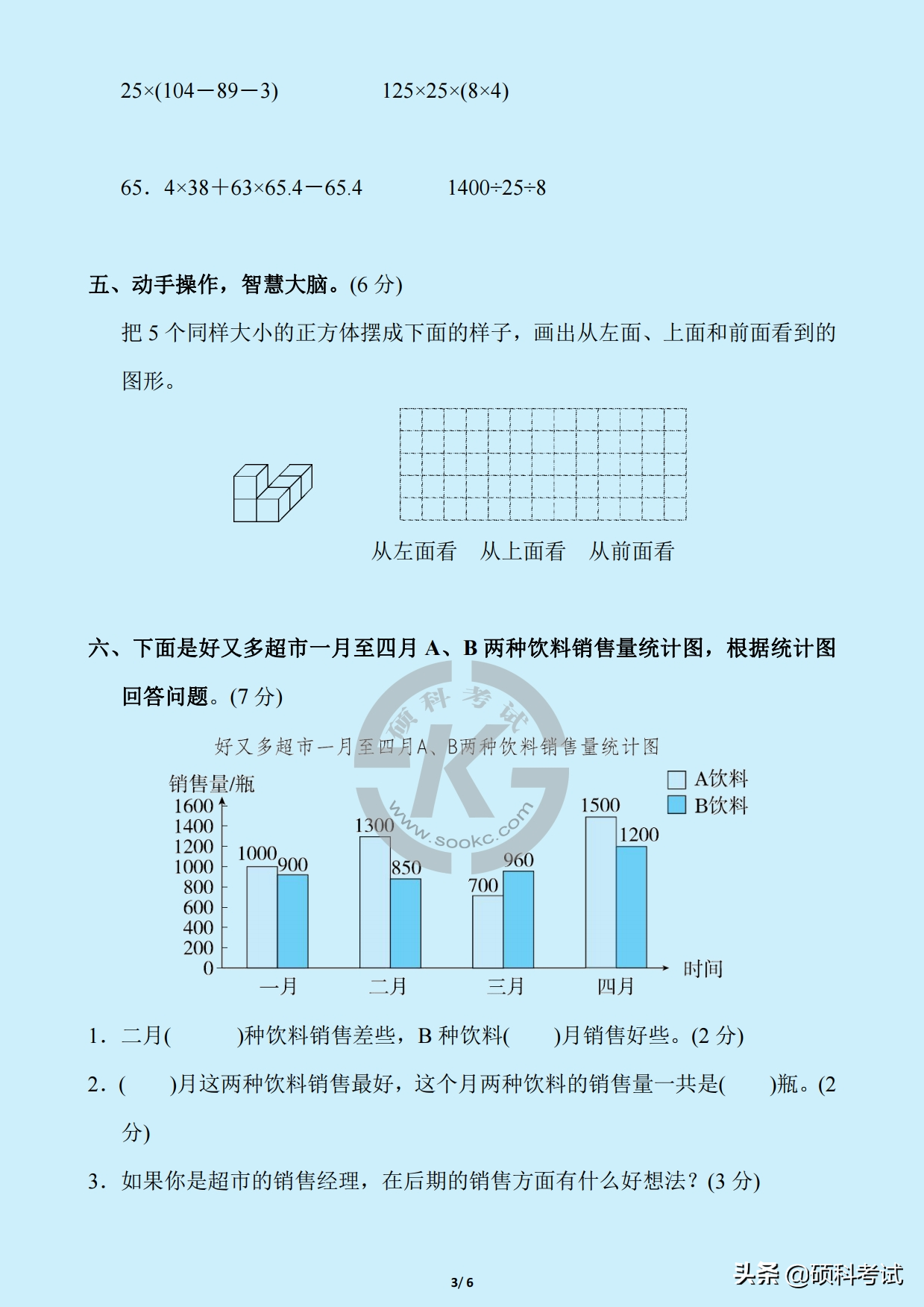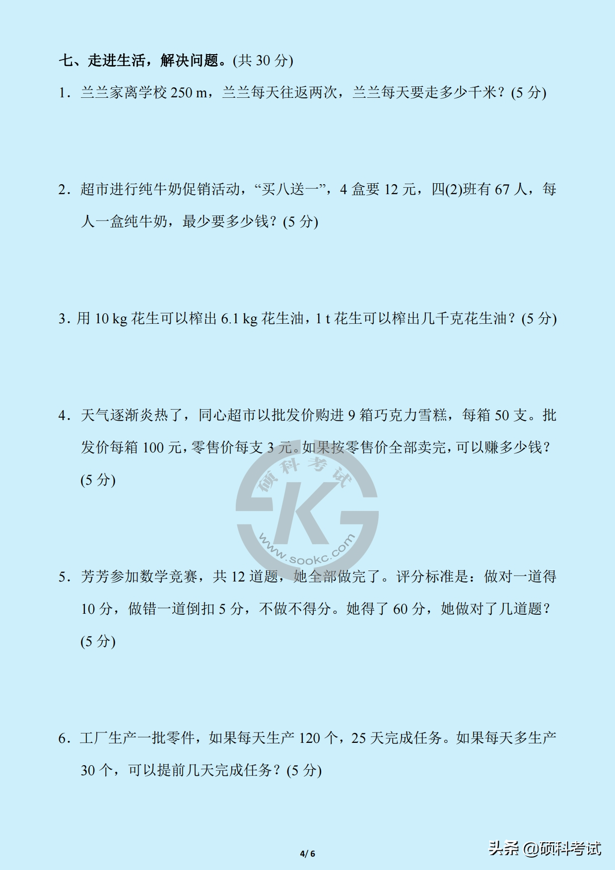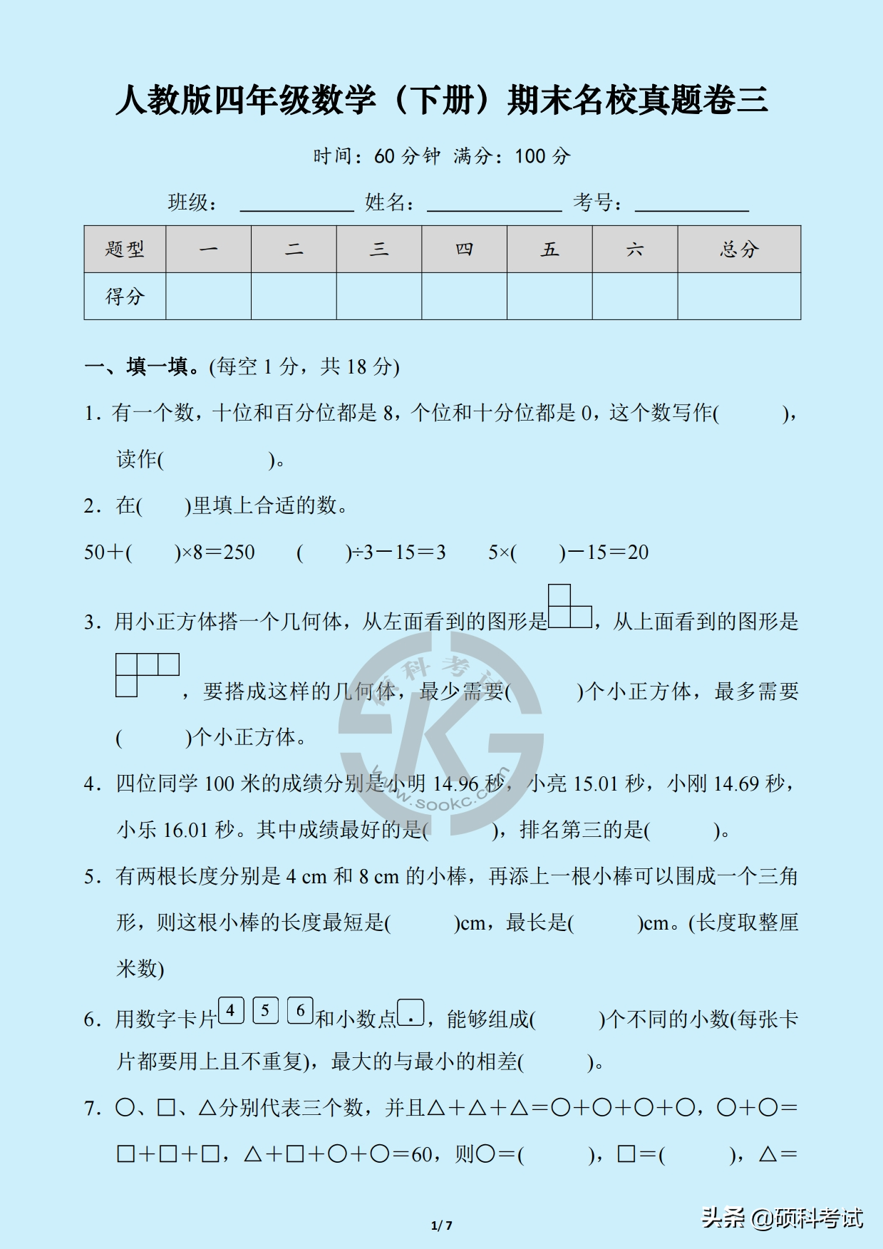 人教版四年级数学下册期末名校真题卷三套主要包括:填一填、辨一辨、选一选、计算挑战、动手操作,智慧大脑、解决问题等题型。附答案考查知识点全面。适合孩子复习本数学基础知识,巩固基础、查缺补漏、期末考试冲刺提分,建议家长给孩子考前提分练习!