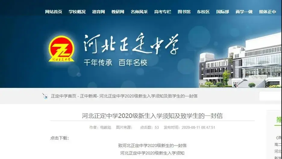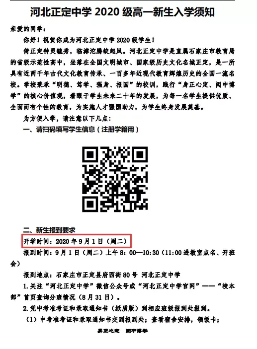 河北正定中学在官方网站上发布《致河北正定中学2020级新生的一封信》其中明确高一年级今年秋季的开学时间为9月1日。