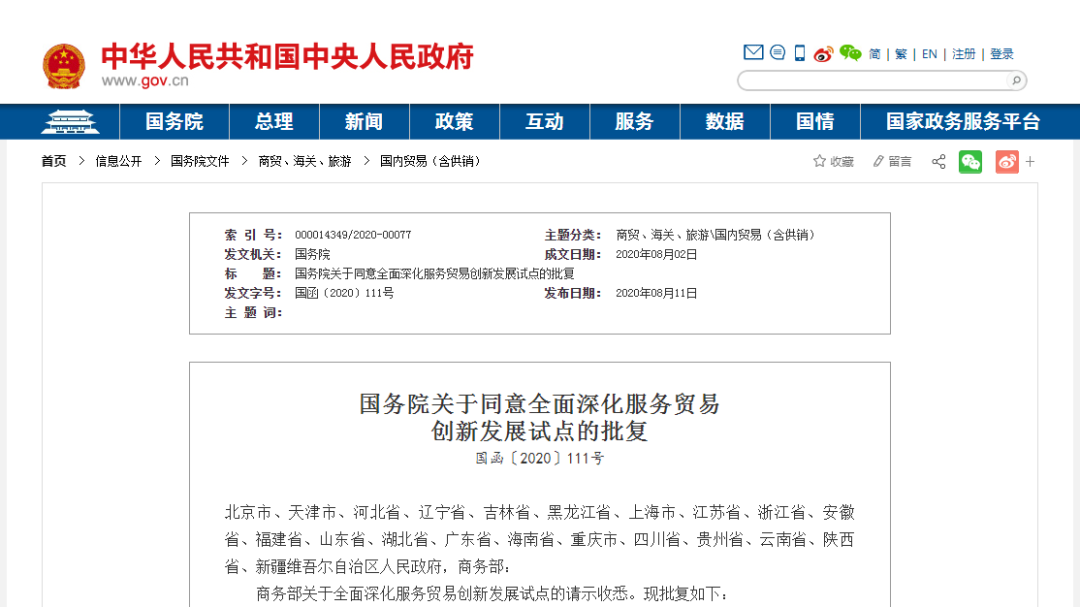 8月11日,中国政府网发布《国务院关于同意全面深化服务贸易创新发展试点的批复》,内容如下↓↓↓