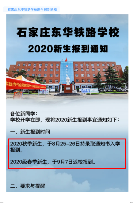 石家庄东华铁路学校在官方公众号中明确提到,2020秋季新生于8月25日~26日持录取通知书入学报到;2020级春季新生于9月7日返校报到。