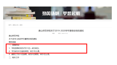 唐山师范学院发布了《关于2019-2020学年暑假安排的通知》,学生8月31日返校报到,9月1号上课。