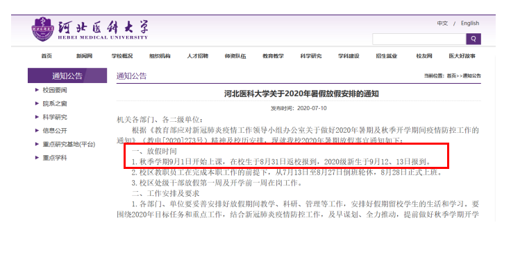 根据河北医科大学发布的《2020年暑假放假安排的通知》该校秋季学期9月1日开始上课,在校生8月31日返校报到,2020级新生于9月12、13日报到。