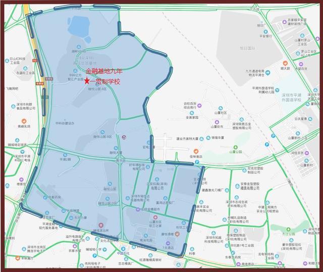 小学招生范围:平大路、清平高速、平龙路、杉坑内环路、惠华路、中环大道围成区域为平湖金融基地九年一贯制学校小学部招生范围。