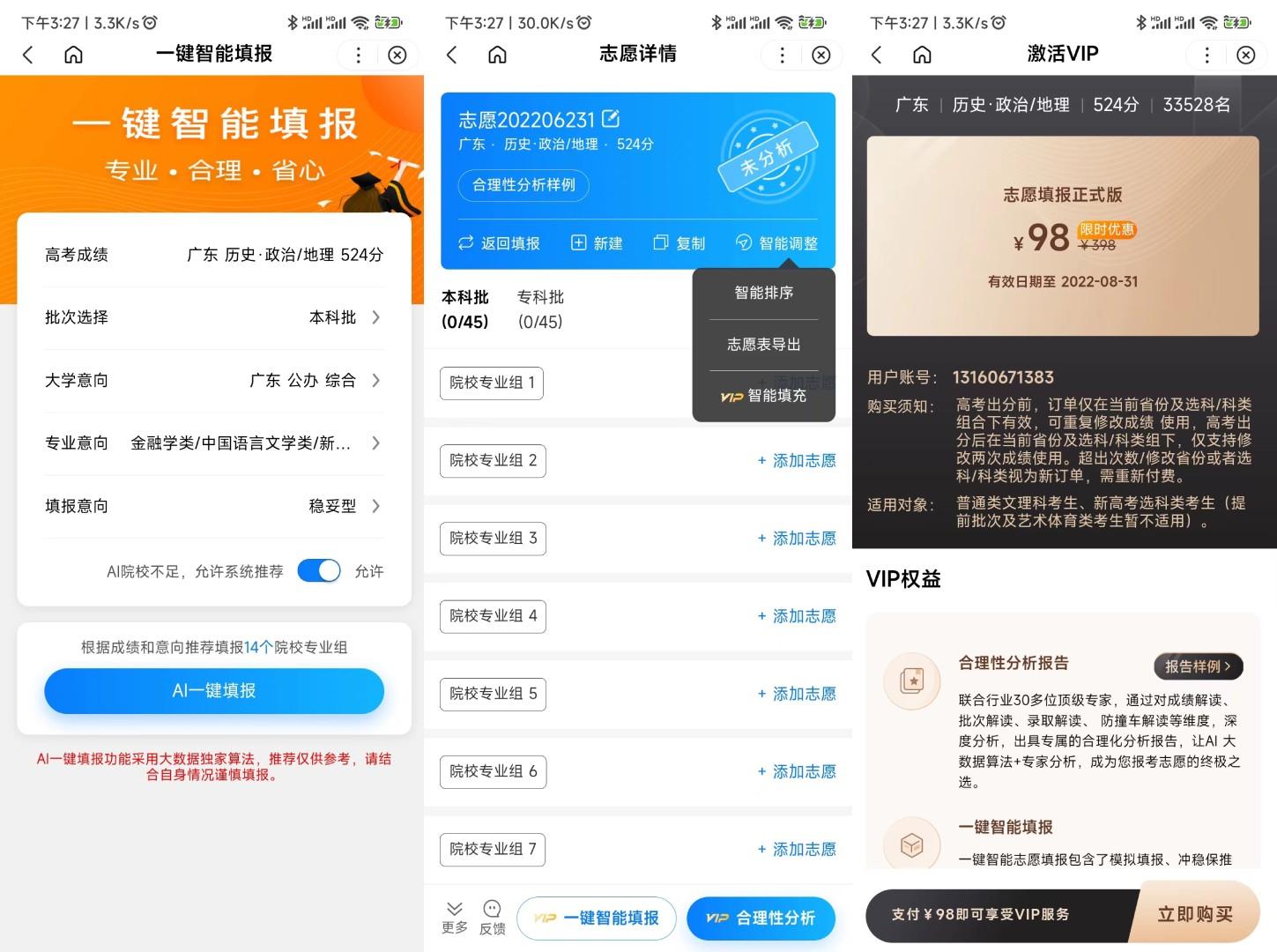 此外,百度高考可以根据用户的意向院校和意向专业,完成志愿表的一键智能填报。遗憾的是,因为这项功能属于VIP专享功能,因此我们没有办法对其进行实时体验,感兴趣的准大学生们不妨自行尝试一下。