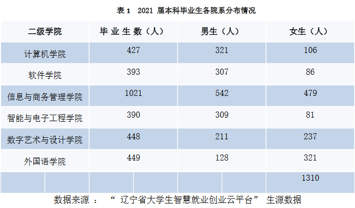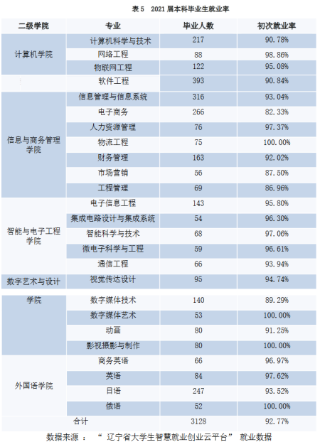 截至2021年8月31日,经辽宁省教育厅审核,学校毕业生3447人,初次就业率为92.86%,其中升学率为8.38%,创业率为0.26%,暂不就业率为0.17%。其中,3128名本科毕业生就业率为92.77%。