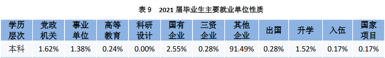 从就业单位性质来看,学校2021届毕业生就业单位主要是其他企业、国有企业。其中,其他其他、中国有企业、党政机关为本科毕业生主要就业单位,另有部分本科毕业生进入事业单位,或选择升学深造等。