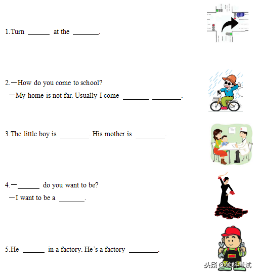 五、1.right, crossing 2.by bike 3.ill, worried 4.What, dancer 5.works, worker