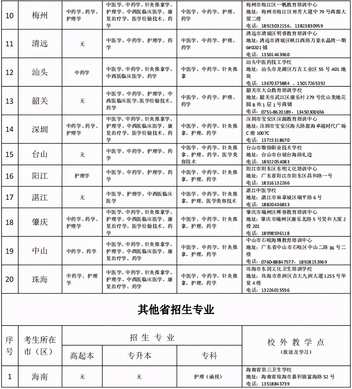 答:我校在全省各地市设有校外教学点(详见附表),均按广东省教育厅的规范要求设立。设立校外教学点主要是为延伸课堂教学的需要,方便不同地区的学生学习。只要是被广州中医药大学正式录取的考生都是广州中医药大学的学生,无论在哪个教学点 学习,修完教学计划规定的全部课程并考核合格后,毕业时同样可取得广州中医药大学毕业证书。
