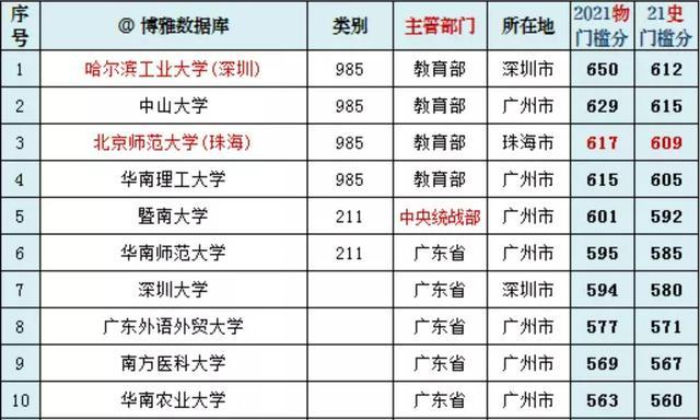 在广东省高校排行榜中,大多数人都会认为,中山大学是当之无愧的第1名,因为中山大学是广东省仅有的2所985大学之一,不管是资历还是实力,都应该是当之无愧的第一。但是,分数线会说话,比较高考最低专业投档分数线时,我们发现,在广东省高校中突出重围的,并不是中山大学,而是哈工大(深圳)。哈工大(深圳)最新高考物理类门槛线为650分,历史类门槛线为612分,其中,物理类门槛线的分数,大幅领先于排名第二的中山大学,中山大学2021年物理类门槛分仅为629分,比哈工大(深圳)整整低了21分,这就是差距。