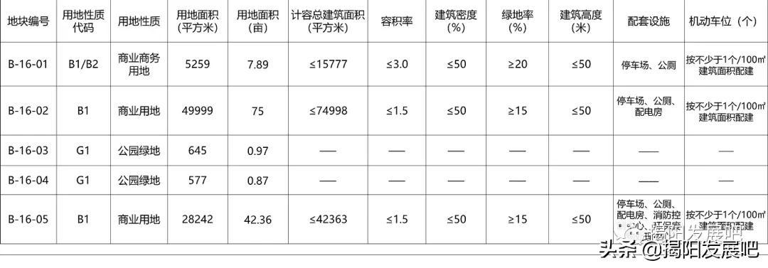 B-16-03、B-16-04用地性质为公园绿地,面积合计0.12公顷(1.84亩)﹔B-16-05用地性质为商业用地,面积为2.82公顷(42.36亩),容积率≤1.5,建筑高度≤50米,建筑密度≤50%,绿地率≥15%。