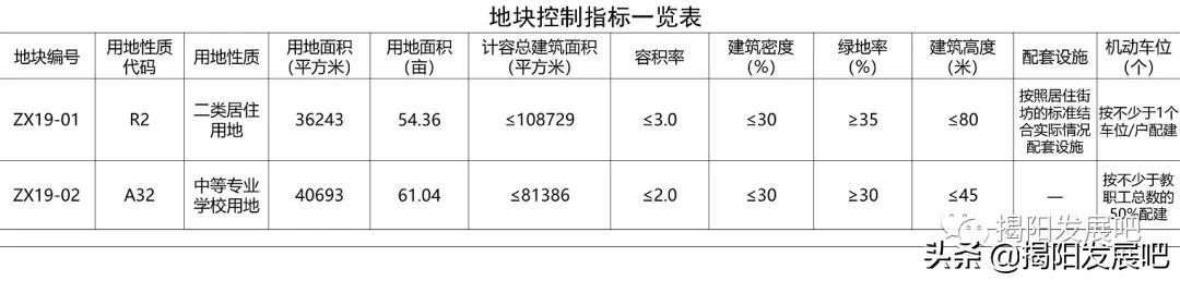 ZX19-01地块用地性质为二类居住用地,面积为3.62公顷(54.36亩),容积率≤3.0,建筑密度≤30%,绿地率≥35%,建筑高度≤80米;