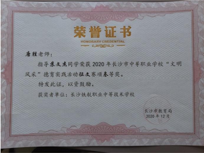 硕士研究生,在“2019年湖南省中等职业学校思想政治教育教学能力竞赛”中,获市一等奖,省三等奖,同期获校“优秀教师”称号。在“2020年长沙市中等职业学校思想政治教育教学能力竞赛”中,获市三等奖,再获校“优秀教师”称号。