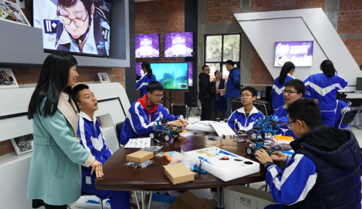 华西中学依托电子科大人工智能科研优势,构建了以人工智能为特色的“一馆五空间”基础创新实验室,包括5个实验空间——互动微科技馆和机器人、智能制造、航空航天、医疗健康、智慧城市空间。
