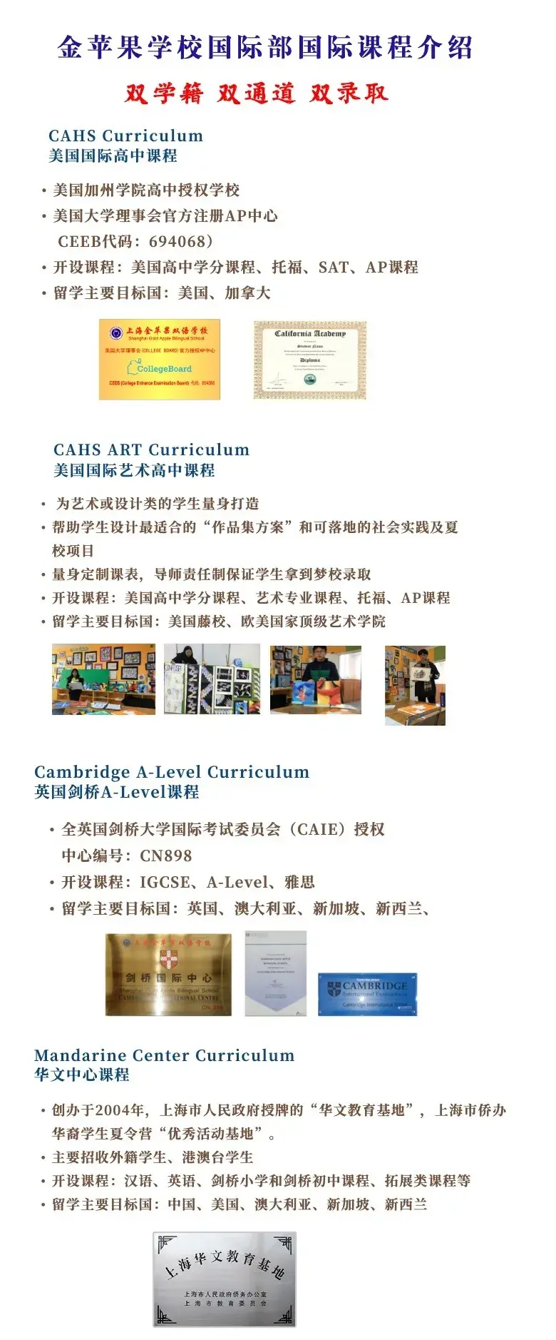 很多国际学校中的课程是可以穿插开的——开设美高课程的国际学校或许没有开设AP课程,开设A-Level课程的学校也会同时开设AP课程,所以家长在择校时还是要仔细观察一下该学校的课程体系,再针对性地进行选择。
