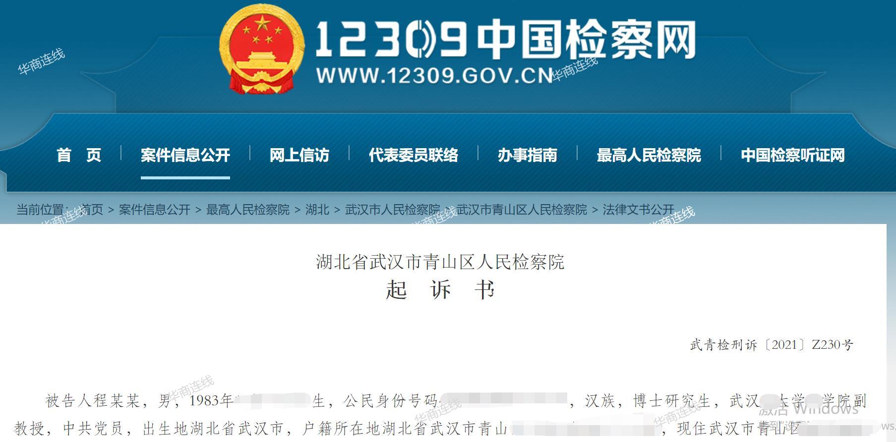 12309中国检察网公布的起诉书显示,被告人程某某(男)出生于1983年,博士研究生,武汉某大学副教授。