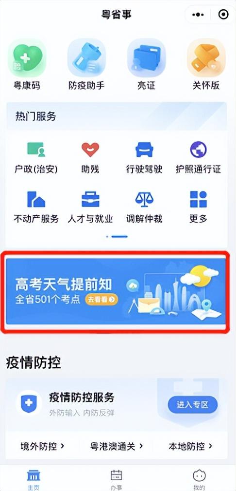 ▲登录"粤省事”小程序,点击图片“高考天气提前知”即可查询各考点天气。
