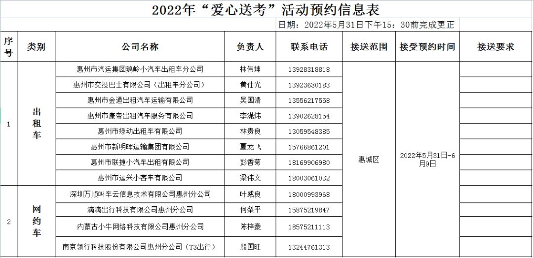 据统计,截至5月31日惠城辖区20家企业共1998辆营运车辆参与“爱心送考”公益活动。考生或其家长可拨打预约电话留下地址和联系方式,即可以免费享受“一对一”、“点对点”的“爱心送考”出租车服务。