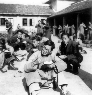 金陵大学的就餐时间,学生们在阳光下席地而坐。