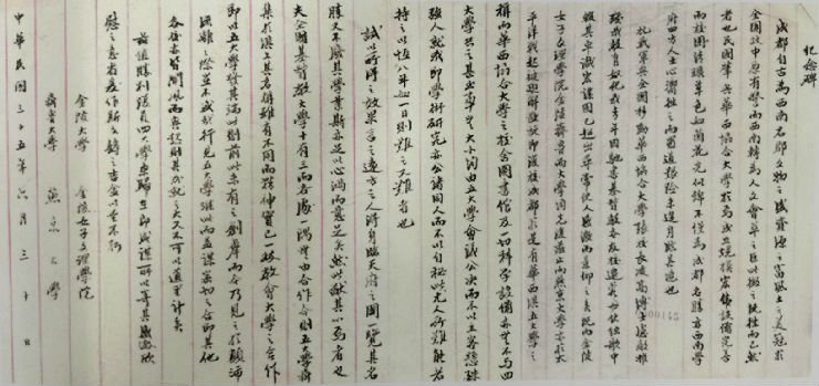 这是1946年6月30日,即将复员的金大、金陵女大、齐鲁和燕京大学共同草拟的一篇纪念碑的碑文。