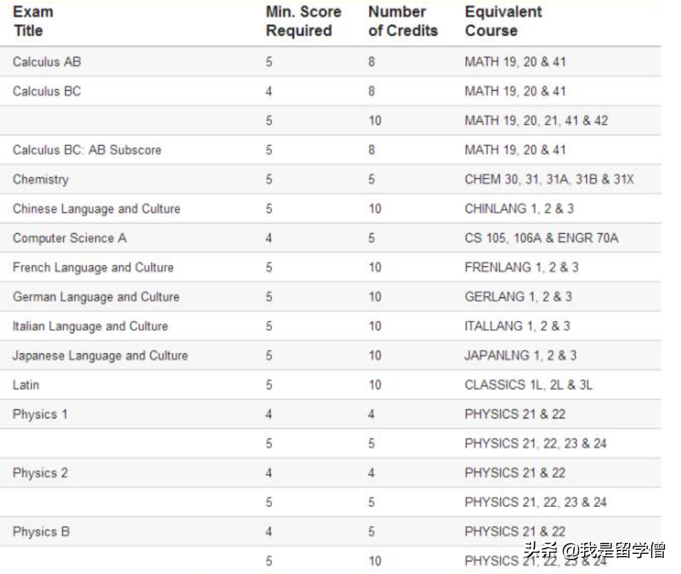 其二,无论你在申请之前还是申请之后参加AP考试,不管是高一还是高三参加,这个成绩都是可以兑换大学学分的,目前全球40多个国家有3600多所大学都表示接受AP成绩。这样在大学就可以少上一部分课,别人4年才能读完的大学, 你可能3年就上完了,这样你就变成别人父母口中的“别人家孩子”了!3年就读完本科,简直就是“神童”~岂不知“神童”其实从高中就开始跟别人有差距了。比如下图为斯坦福大学的AP换分政策,如果你参加了微积分AB的考试并且拿到了5分,那你可以换到8个学分,既省钱又省时间,何乐而不为?