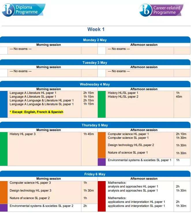 新加坡的IBDP平均分数为37.69分,超过全球平均水平;比去年新加坡平均成绩34.52分高9.2%;新加坡共有59名学生取得45分的最高分;今年在新加坡获得IB成绩的学生人数为1,679人,而去年为1,663人;新加坡的考试及格率为97.9%,高于全球通过率88%;42.8%的新加坡学生取得了40+分;新加坡IBDP平均成绩5.9,高于全球平均5.19分。考试安排