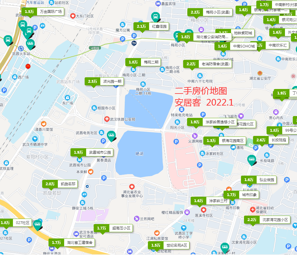 3、从价格变化的角度来看,这里选取了2020年9月、2022年1月两个时间点的代表性小区二手房价格(数据来自链家网、安居客),晴空云鹤发现,在这一年多的时间里,在武昌火车站以东梅苑、晒湖片区,梅苑学校小学部、晒湖中学小学部、晒湖小学分别对口的小区,二手房价格总体比2020年有所下滑(微跌),少数持平。