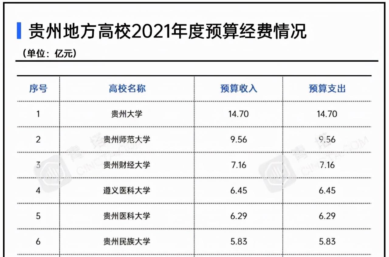 就已公布的数据显示,共计13所贵州市地方高校进入榜单,其中贵州大学、贵州师范大学、贵州财经大学居榜单前3名,是贵州省地方高校中预算经费相对较多的大学,预算收入分别为14.7亿、9.56亿、7.16亿,紧随其后的为遵义医科大学、贵州医科大学、贵州民族大学、贵州中医药大学等。