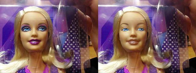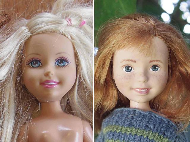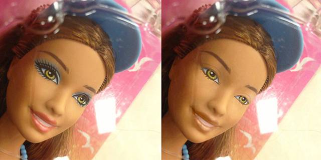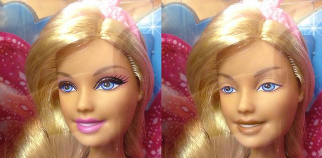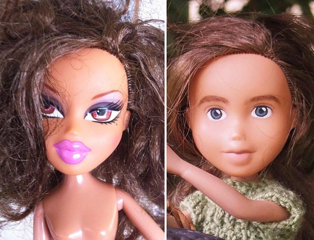 曾经有一位叫Eddi Aguirre的设计师,因为看不惯芭比娃娃总是一丝不苟的美貌,就通过技术手段给她们卸了妆↓