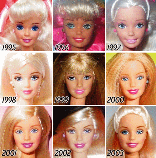 截至15年,芭比娃娃一共换了56张脸,基本上没有她没尝试过的脸型和发型...