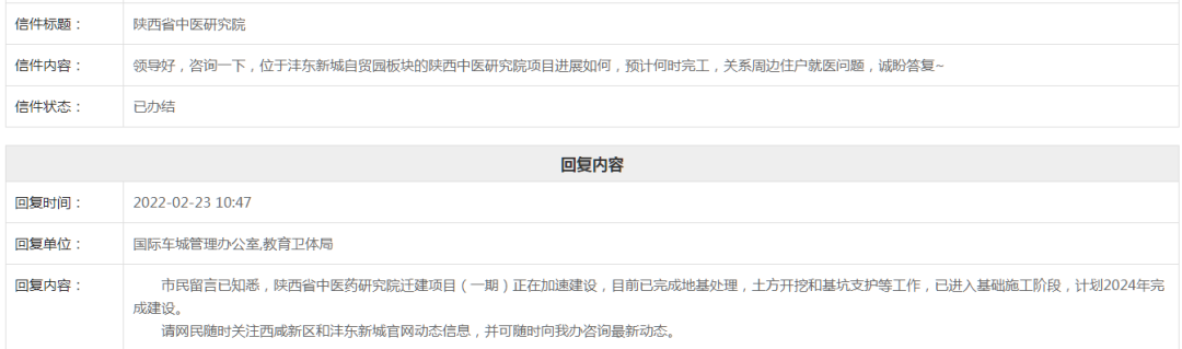 问:位于沣东新城自贸园板块的陕西中医研究院项目进展如何,预计何时完工,关系周边住户就医问题,诚盼答复~