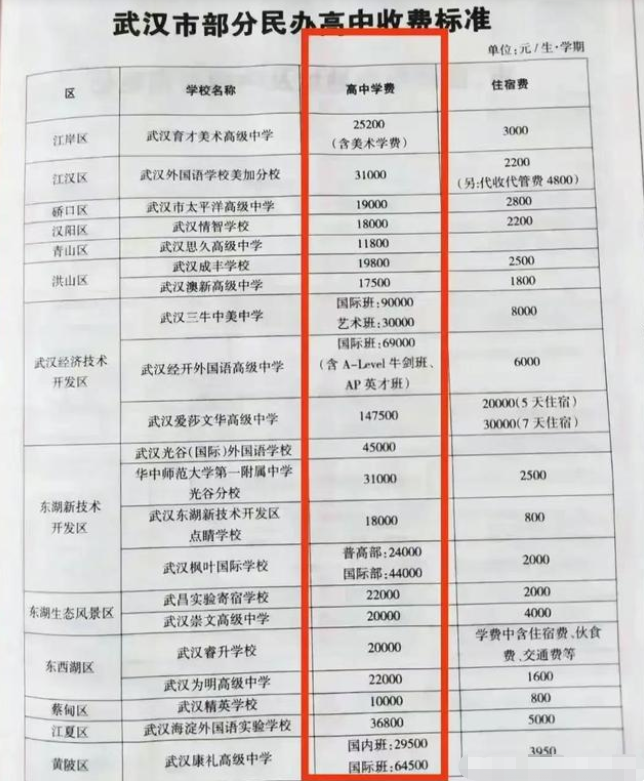 很多家长都因为担心学生无法拥有上大学的机会,所以也就直接把学生送到私立高中,可是学费实在是太高了,在武汉有一家民办高中的收费就让家长大为震惊,捏紧了钱包。