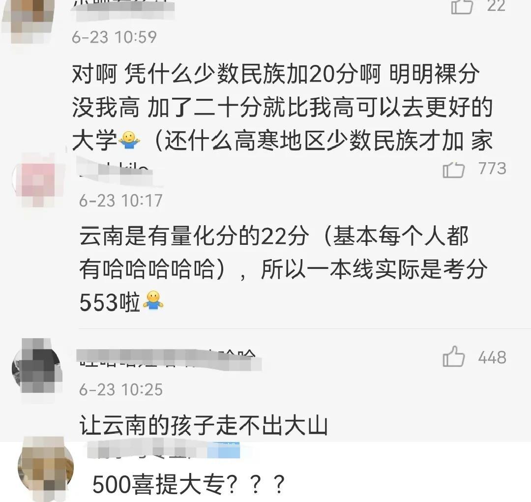 云南文史类本科分数线为505分,500分到505分之间有近3000人,加上有的考生虽然到达了本科线,但不一定能上本科,最后将有更多的500分考生只能走专科。很多云南考生说:这是想让云南的孩子走不出大山吗?
