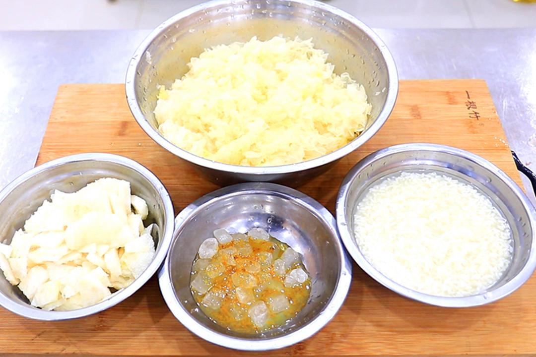 1.银耳用凉水泡发,去除黄色的硬根,撕成小朵,银耳一定要用凉水泡口感才会清脆,用热水泡出来比较绵软,而且不容易出胶;梨去核、切成片;冰糖30克放入碗中,再加入适量的桂花酱增加温润感;另外准备半碗米酒备用。